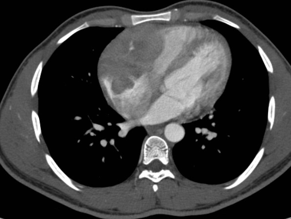 La TC permetteva di confermare la malignità della massa, sulla base della sua infiltrazione miocardica e pericardica. Nella fase post-contrasto una scarsa vascolarizzazione del tumore rappresentava una differenza significativa rispetto al tessuto riccamente vascolarizzato dell'angiosarcoma (che è il più frequente tumore cardiaco maligno). Inoltre, la TC evidenziava che il tumore cardiaco continuava nel mediastino superiore in una massa uniforme di linfonodi patologici con lo stesso pattern di segnale. Questo riscontro suggeriva la diagnosi di linfoma. D'altra parte, la mancanza di altre metastasi escludeva la diagnosi di angiosarcoma e di sarcomi in generale.
