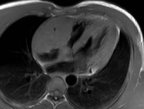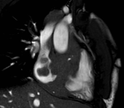 La risonanza magnetica (RM) cardiaca presentava nelle sequenze cine-SSFP (Steady State Free Precession) all’interno delle camere destre una massa ipointensa, infiltrante le pareti del miocardio, il pericardio, la valvola tricuspide, la radice aortica e la vena cava superiore (Figura 4).