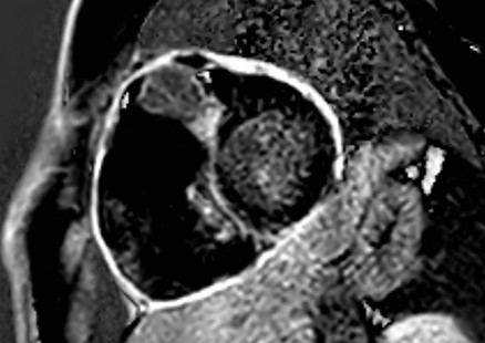 Il tumore appariva iperintenso nelle sequenze STIR (Short Time Inversion Recovery) T2 pesate (Figura 7) e presentava un lieve ed eterogeneo enhancement tardivo del gadolinio nelle immagini PSIR (Phase Sensitive) (Figura 8).