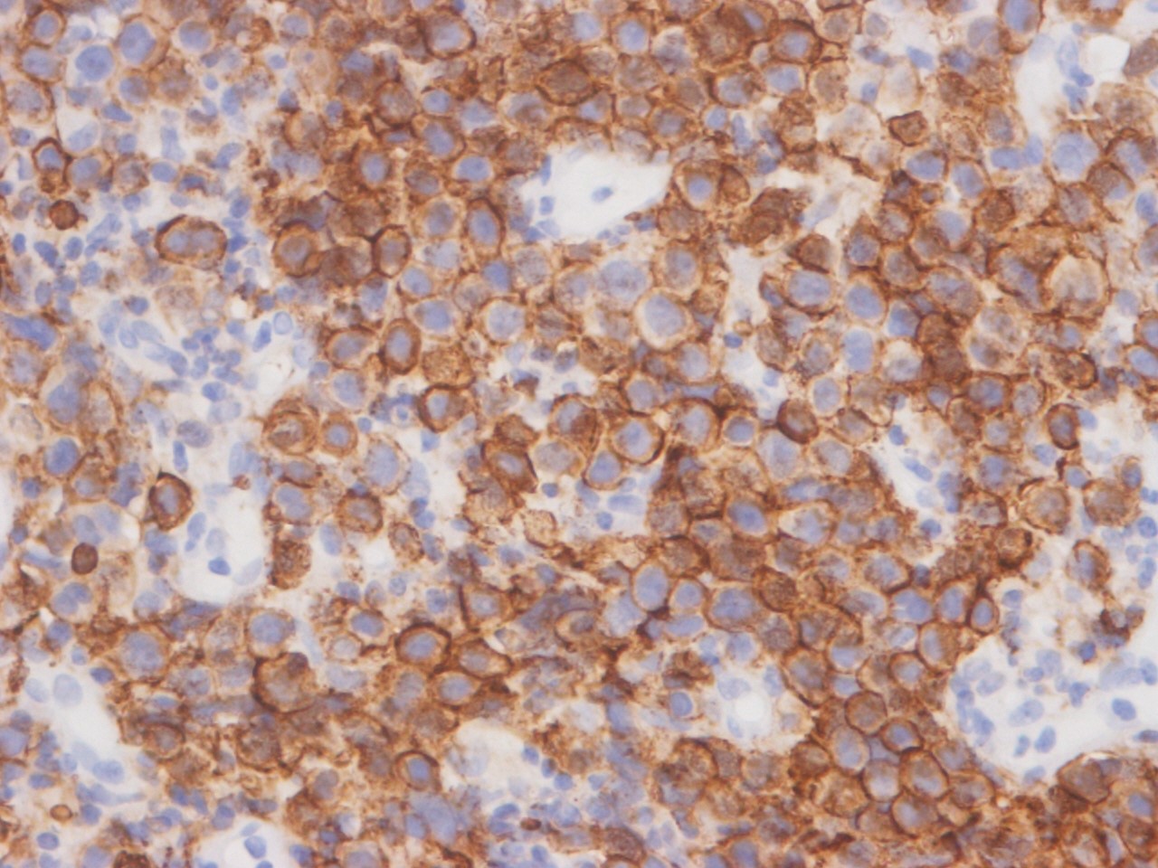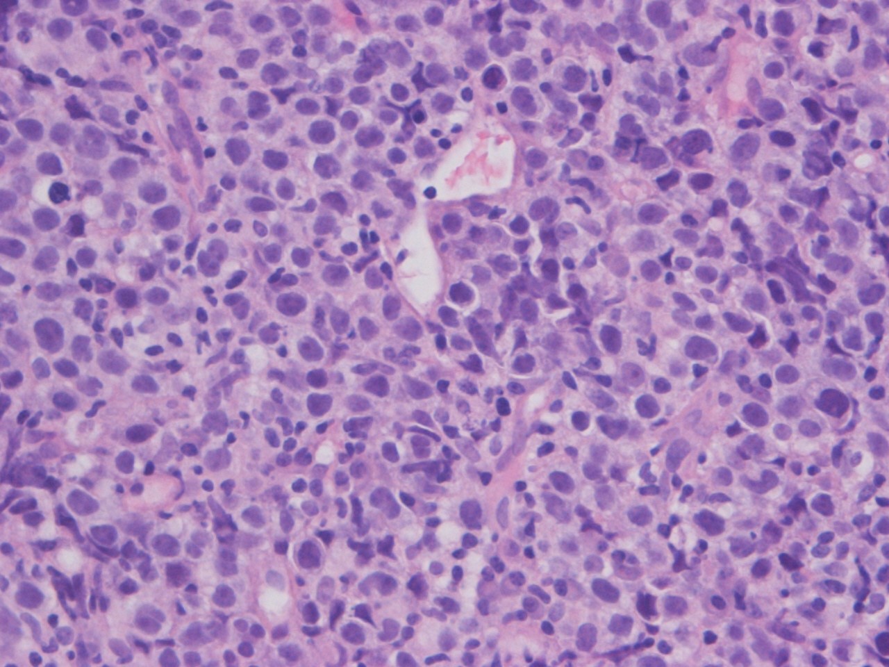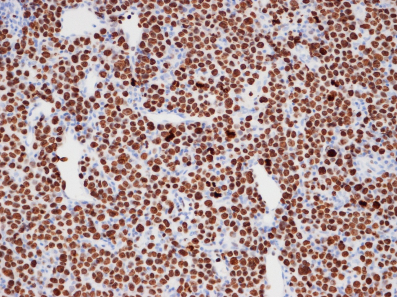 Dopo la diagnostica d’immagine, è stata eseguita sotto guida ETT una biopsia intramiocardica transvenosa. L'esame istologico rilevava un infiltrato di cellule di medie e grandi dimensioni con aspetto linfoide (Figura 9), positivo alla colorazione per CD20 (Figura 10) e per ki67 (Figura 11). È stato così possibile alla fine formulare una diagnosi di linfoma cardiaco primario a cellule B ad alto grado.