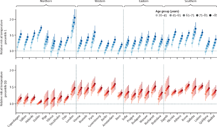 Un confronto dei rischi specifici per età associati al freddo e al caldo nella capitale di ciascun paese è evidenziato nella figura 2, che mostra gli RR al primo e al 99° percentile rispetto all'MMT ( (minimum mortality temperature) calcolata per cinque diversi gruppi di età.