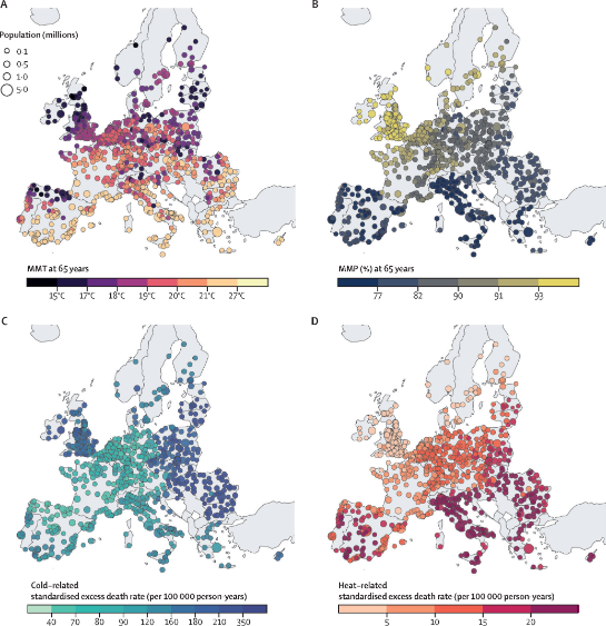 I risultati e le mappe fornite in questo studio offrono un quadro completo dell'impatto sulla mortalità della temperatura non ottimale in tutta Europa, che caratterizza le differenze geografiche nella vulnerabilità tra le popolazioni urbane in tutto il continente.