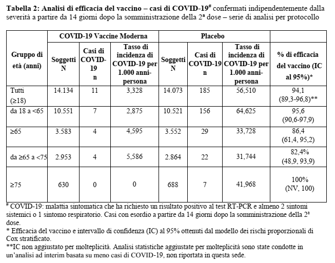 La popolazione per l’analisi di efficacia primaria (di seguito indicata come serie di analisi per protocollo, PPS) ha compreso 28.207 soggetti che hanno ricevuto COVID-19 Vaccine Moderna (n=14.134) o placebo (n=14.073) e che erano negativi al SARS-CoV-2 al basale. La popolazione dello studio per la PPS era per il 47,4% di sesso femminile e per il 52,6% di sesso maschile, per il 79,5% bianca, per il 9,7% di etnia afro-americana, per il 4,6% asiatica e per il 6,2% di altre etnie. Il 19,7% dei partecipanti si era identificato come ispanico o latino. L’età mediana dei soggetti era di 53 anni (range:18-94). Per l’inclusione nella PPS era consentita una finestra di dosaggio da -7 a +14 giorni per la somministrazione della seconda dose (programmata al giorno 29). Il 98% di coloro che hanno ricevuto il vaccino ha ricevuto la seconda dose da 25 a 35 giorni dopo la dose 1 (corrispondenti a una finestra da -3 a +7 giorni intorno all’intervallo di 28 giorni).