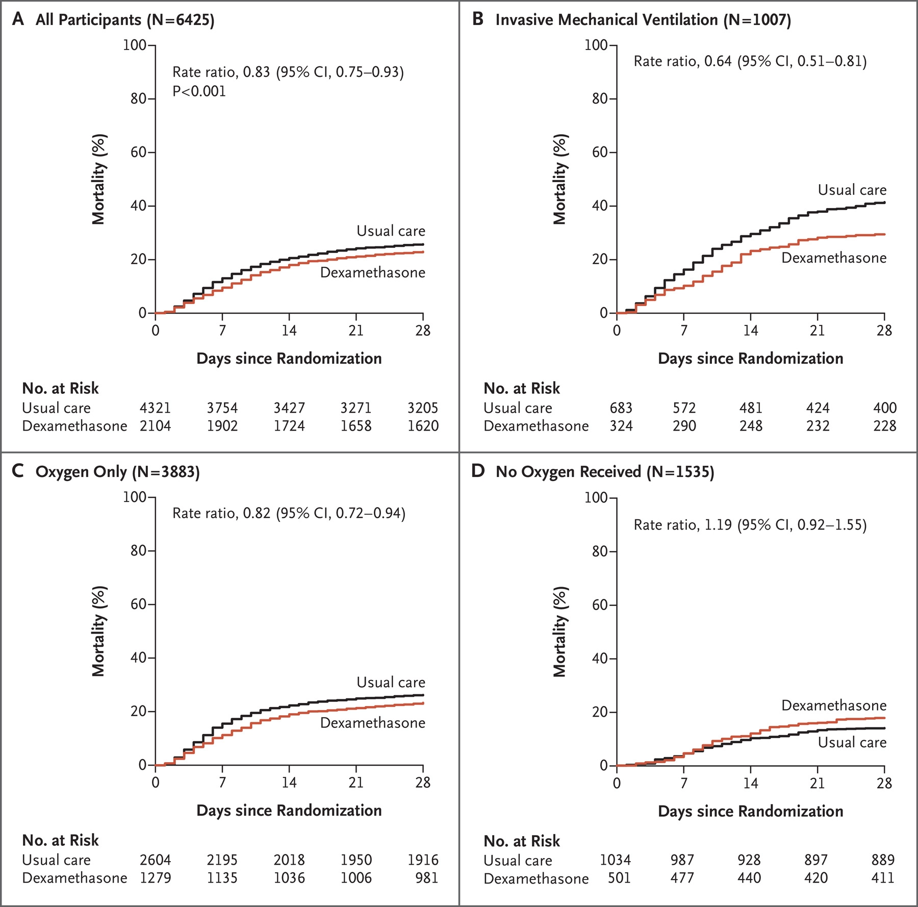 Fonte: RECOVERY Collaborative Group, Horby P, Lim WS, Emberson JR, Mafham M, Bell JL, Linsell L, Staplin N, Brightling C, Ustianowski A, Elmahi E, Prudon B, Green C, Felton T, Chadwick D, Rege K, Fegan C, Chappell LC, Faust SN, Jaki T, Jeffery K, Montgomery A, Rowan K, Juszczak E, Baillie JK, Haynes R, Landray MJ. Dexamethasone in Hospitalized Patients with Covid-19. N Engl J Med. 2021 Feb 25;384(8):693-704. doi: 10.1056/NEJMoa2021436. Epub 2020 Jul 17. PMID: 32678530; PMCID: PMC7383595.