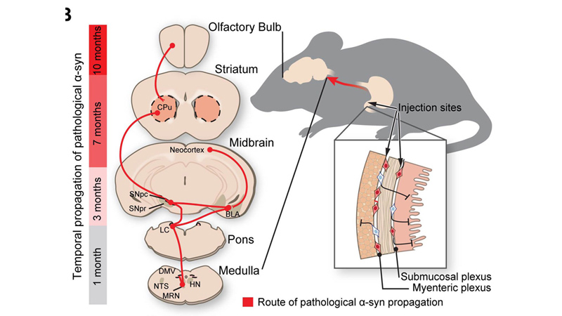 Uno studio recente condotto dalla Johns Hopkins University School of Medicine ha cercato di approfondire le conoscenze relative allo sviluppo della patologia. Il nuovo studio si basa sulle osservazioni fatte nel 2003 dal neuroanatomista tedesco Heiko Braak, che ha dimostrato la presenza di accumuli di α-sinucleina mal ripiegata anche nei neuroni enterici dei pazienti affetti da morbo di Parkinson. Numerose prove sostengono la forte connessione intestino-cervello nell’esordio e nello sviluppo della malattia. I ricercatori di Baltimora hanno ipotizzato che l’α-sinucleina mal ripiegata possa migrare dall’intestino al cervello attraverso il nervo vago, che decorre dal cervello fino all’addome.
