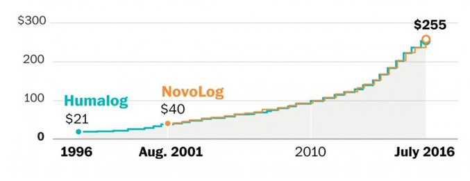 Nel 1996, quando uscì l'Humalog di Eli Lilly, il prezzo per una fornitura di insulina per un mese era di 21 dollari. Nel 2001 una confezione è aumentata da 14 a 35 dollari. Nel 2019, il costo di una confezione si aggira intorno ai 275 dollari. Si tratta di un aumento del 1200% rispetto al prezzo originale. (fonte: The New York Times)