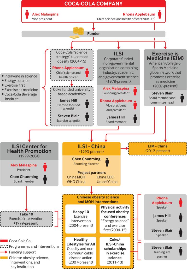 Coca-Cola ha fatto sì che la politica governativa per combattere la crescente epidemia di obesità non compromettesse i suoi interessi. Per farlo utilizzava la filiale cinese dell’ILSI (International Life Sciences Institute), un'organizzazione creata nel 1978 al fine di promuovere i propri interessi in tutto il mondo. L'ILSI è ospitato all'interno del CDC (Chinese Centre for Disease Control and Prevention), un'unità del ministero della salute del governo.