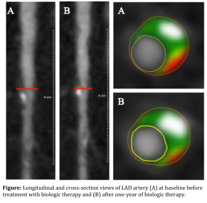 Durante lo studio di un anno, l'infiammazione sistemica valutata dai marcatori ematici si è ridotta solo nel gruppo in terapia biologica. Secondo il team di ricerca è troppo presto per dire se i farmaci biologici esercitano i loro effetti sulle placche coronariche direttamente o riducendo l'infiammazione sistemica.