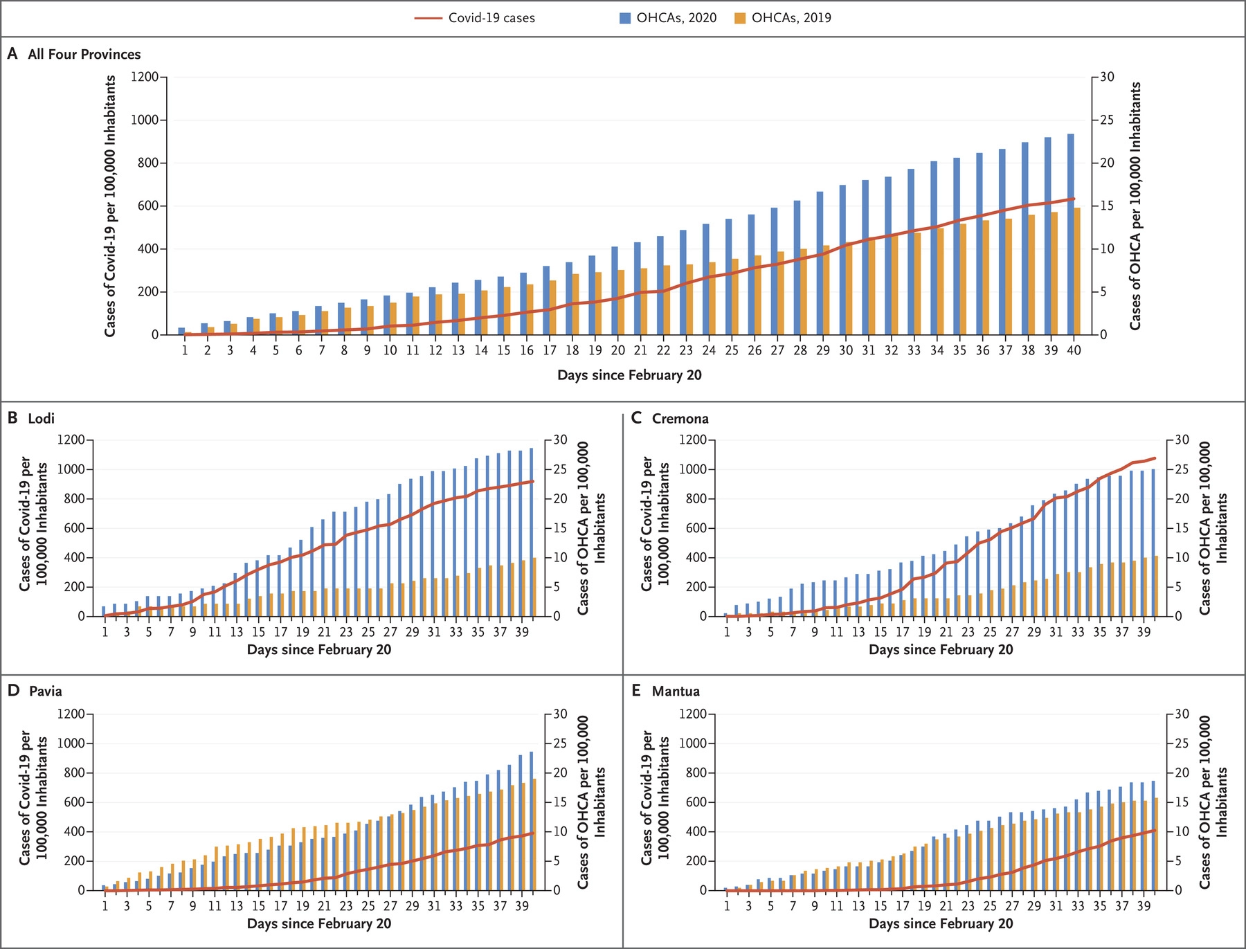 Fonte: Baldi E, Sechi GM, Mare C, et al. Out-of-Hospital Cardiac Arrest during the Covid-19 Outbreak in Italy [published online ahead of print, 2020 Apr 29]. N Engl J Med. 2020;10.1056/NEJMc2010418. doi:10.1056/NEJMc2010418