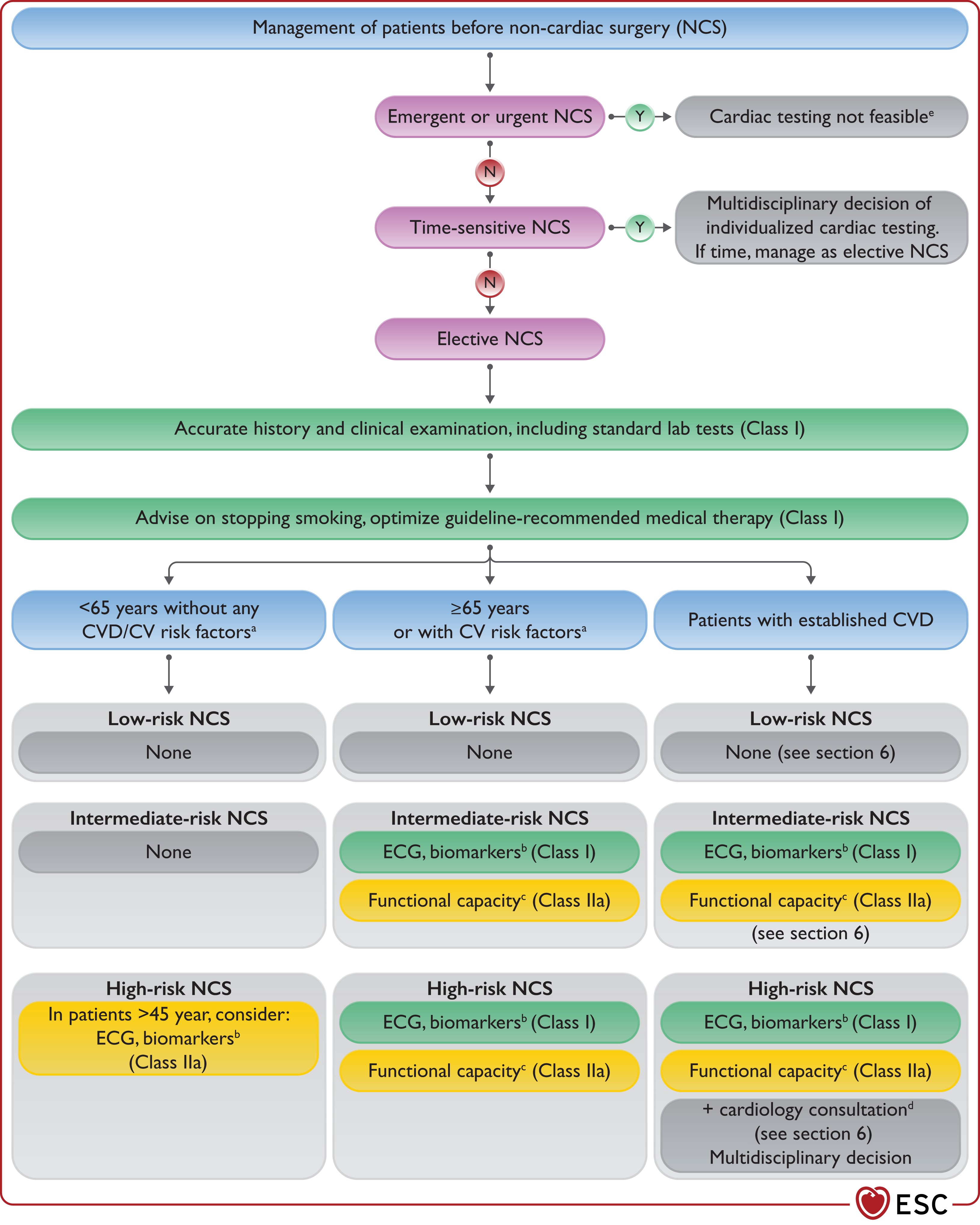• Se la NCS è urgente, un processo decisionale multidisciplinare individualizzato deve determinare il rischio/beneficio di test cardiaci e sforzi di ottimizzazione rispetto all'esecuzione immediata dell’intervento.