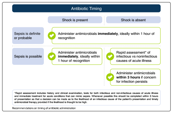 A conferma di quanto espresso nelle linee guida precedenti, l’antibiotico va iniziato immediatamente (entro 1 ora) nei pazienti in shock o con un forte sospetto per sepsi. Nei pazienti senza shock e con una sepsi “possibile” è invece raccomandato un rapido percorso di diagnosi differenziale con altre possibili cause, purchè l’eventuale antibiotico venga iniziato entro 3 ore.
