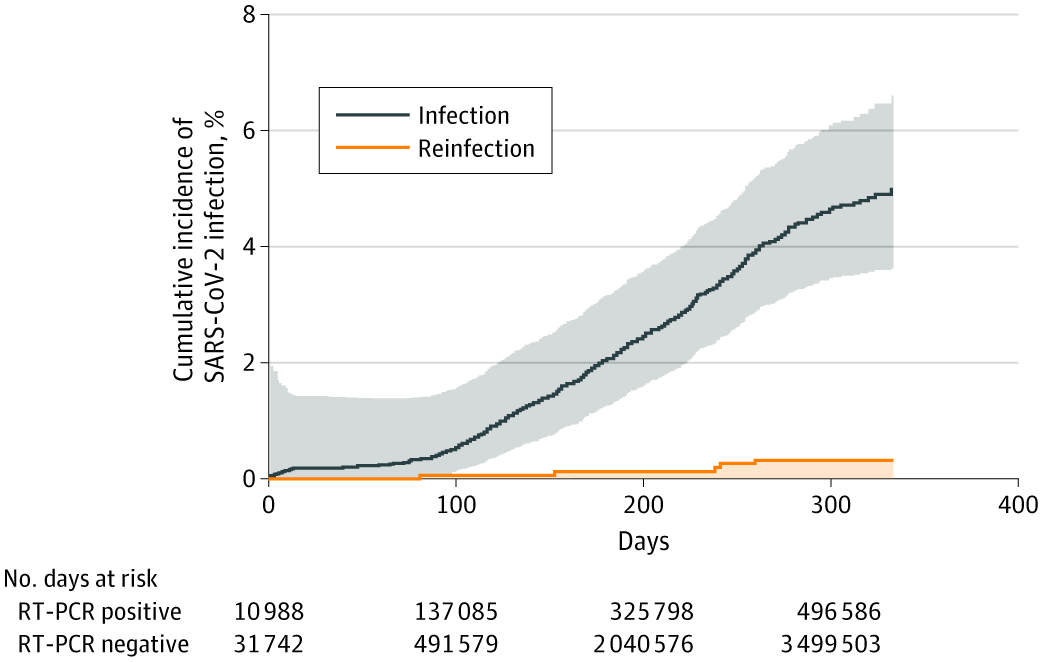 Di 13.496 persone che inizialmente non erano infettate dalla SARS-CoV-2, 528 (3,9%; 95% CI, 3,5%-4,2%) hanno successivamente sviluppato un'infezione primaria. La densità di incidenza per 100.000 giorni-persona è stata di 1,0 (95% CI, 0,5-1,5) per le reinfezioni rispetto a 15,1 (95% CI, 14,5-15,7) per le nuove infezioni. Il rapporto tra tassi d'incidenza aggiustato per età, sesso, etnia e area sanitaria era di 0,07 (95% CI, 0,06-0,08).
