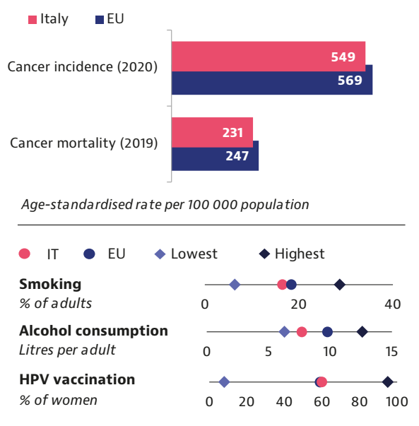 L'Italia sta ottenendo risultati relativamente buoni sugli indicatori di qualità, con tassi di sopravvivenza al cancro leggermente superiore alla media dell'UE. L'Italia ha creato un sistema di reti di assistenza per ridurre le disuguaglianze di accesso tra le regioni. Sono stati istituiti percorsi per i pazienti per garantire un'assistenza olistica e multidisciplinare per tutti. I registri tumori locali coprono il 70% della popolazione italiana e un registro nazionale dei tumori alimentato dai registri regionali è in fase di sviluppo. Gli indicatori di qualità indicatori di qualità delle cure oncologiche non sono ancora diffusi.