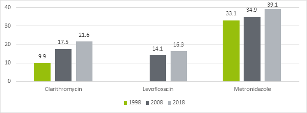 2. Glupczynski et al. EJCMID 2001, Megraud et al. Gut 2013 and Megraud, F et al., 2019. European survey of Helicobacter pylori primary resistance to antibiotics – Evolution over the last 20 years