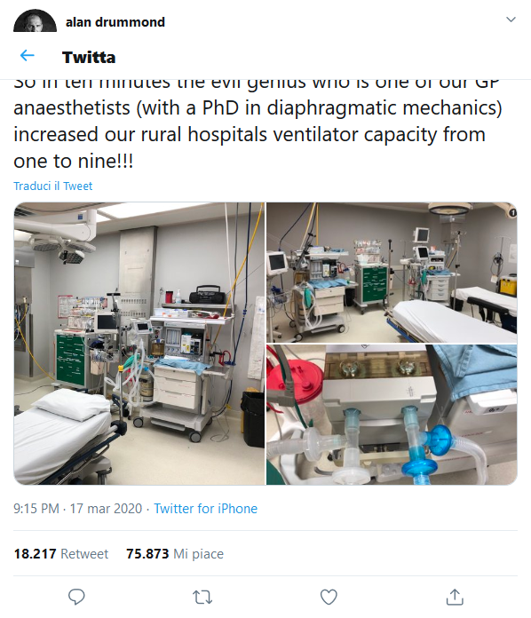 Questa possibilità è in fase di studio anche in Italia. L'idea è stata proposta dal Prof. Marco Ranieri, ordinario al Dipartimento di Scienze mediche e chirurgiche dell’Università di Bologna, che ha ideato insieme ad alcuni colleghi lombardi un circuito in grado di collegare un solo ventilatore a due pazienti. I prototipo del nuovo dispositivo è stato poi realizzato nel giro di tre giorni da un’azienda di Mirandola, distretto biomedicale modenese, la Intersurgical. "Nei prossimi giorni potremo ordinarli e naturalmente saranno consegnati prima a Piacenza e Parma, le aree più critiche", ha dichiarato Sergio Venturi, commissario per l'emergenza della regione Emilia-Romagna.